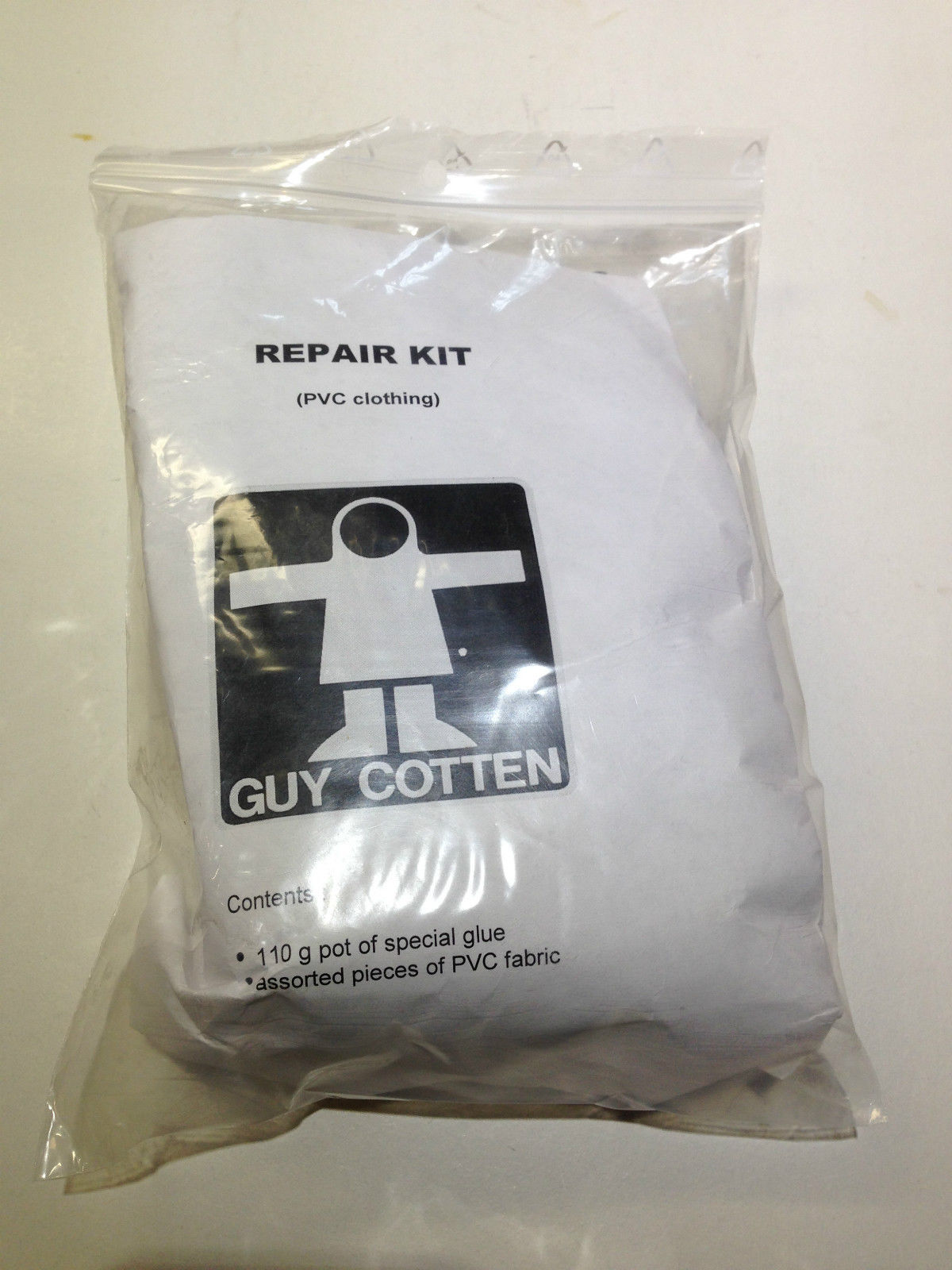 POT OF PVC GLUE WITH PATCHES OF FABRIC.