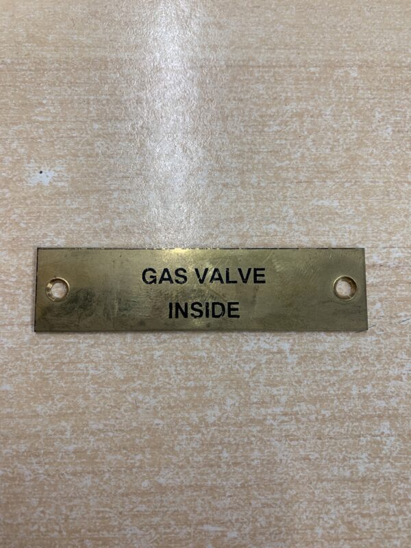 “GAS VALVE INSIDE” Safety Warning Label Flat Brass 74mm x 19mm Laser Cut Letters
