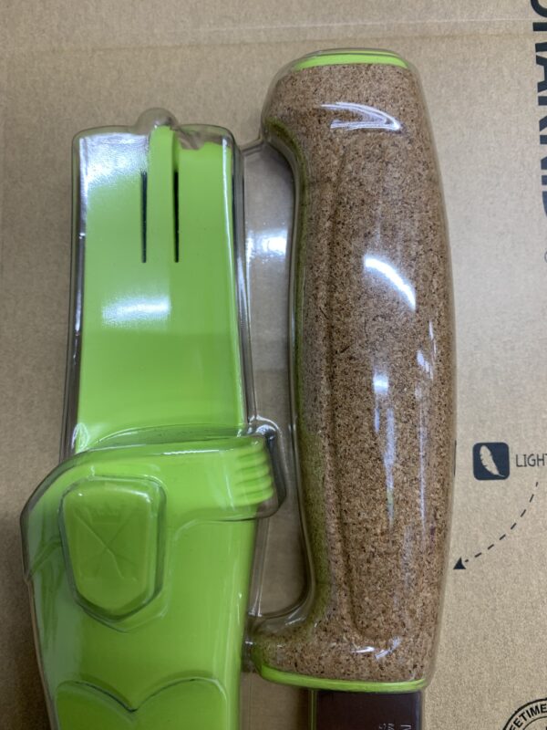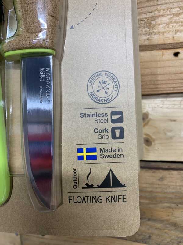 This floating knife is made for marine environments. The handle is made of natural cork that enables the knife to float in the water. Its lime green colour is highly visible making it easy to locate. The 1,4mm thin blade is made of Swedish stainless steel and has a Scandi Grind profile that makes it easy to keep sharp.