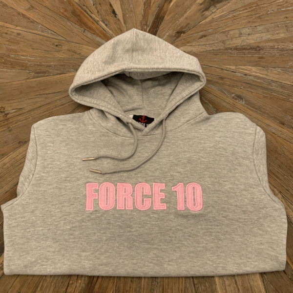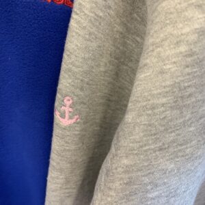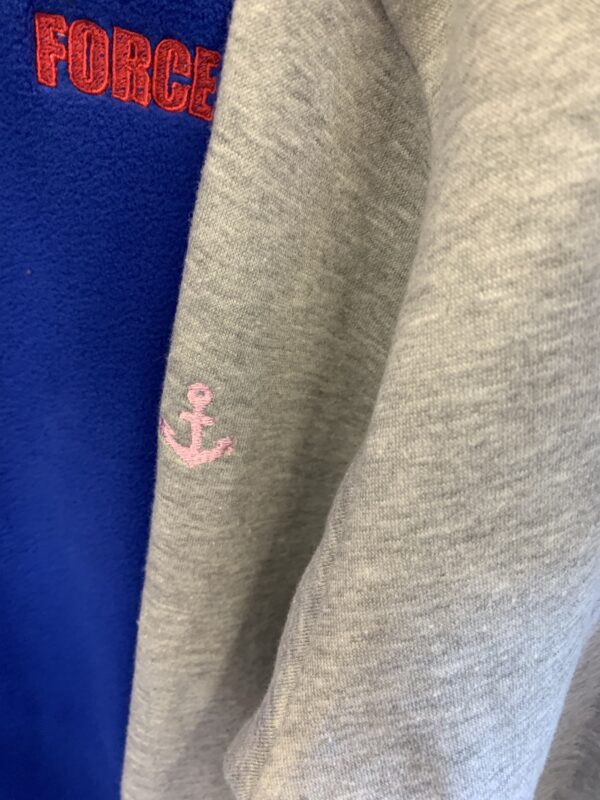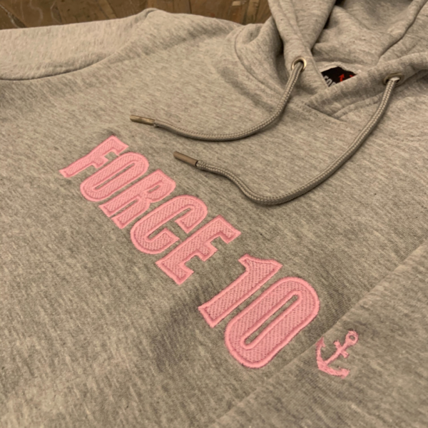 Our embroidered anchor on the left arm and FORCE 10 in pink across the front.. get the cosy yacht look.